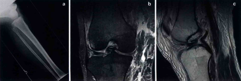 图 a.膝关节脱位X线片;b.膝关节脱位的MRI冠状位;c.矢状位MRI