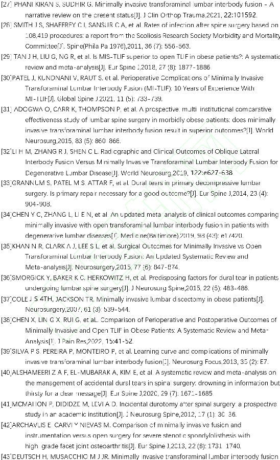 PHANI KIRAN等[27]进行的meta分析结果显示,MIS-TLIF并发症发生率为11%~31.37%。不同研究对并发症的分类有差异,常见并发症包括手术部位感染、硬膜撕裂、神经损伤、螺钉位置不良、椎间融合器移位、邻近节段病变(包括邻近节段退变和邻近节段疾病)等。