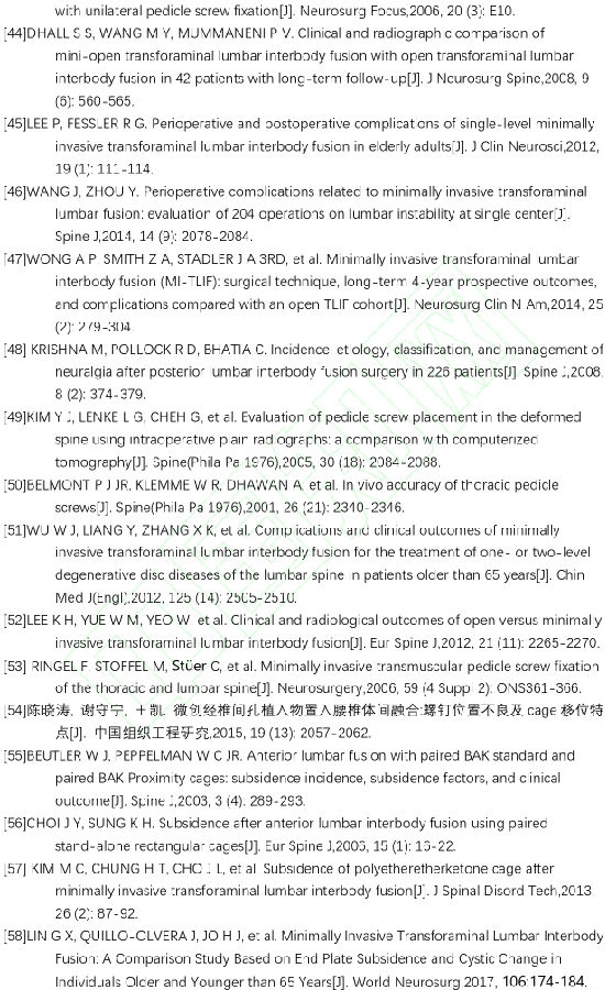 微创技术是外科手术发展的潮流,也是脊柱手术发展的趋势。MIS-TLIF已发展为一种成熟的手术方式,无论是与传统开放手术比较,还是与其他微创融合手术比较,其有效性与安全性均值得肯定。