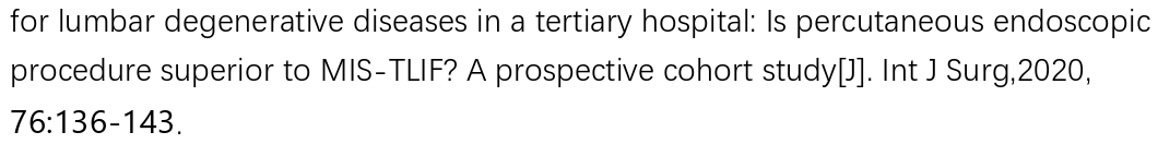 经皮内窥镜TLIF(PE-TLIF)在MIS-TLIF的基础上进一步减少了椎旁肌肉的损伤,且无需切除椎板、上下关节突和黄韧带[72]。AO等[73]进行的前瞻性研究对比PE-TLIF(35例)和MIS-TLIF(40例)患者发现,PE-TLIF组患者出血量、住院时间均显著少于MIS-TLIF组,PE-TLIF组患者手术时间则更长,两组患者术后1年腰、腿的VAS、ODI评分,以及融合率比较,差异均无统计学意义(P>0.05)。