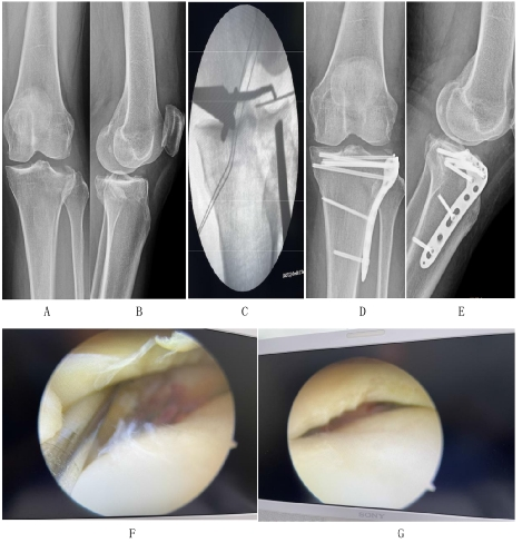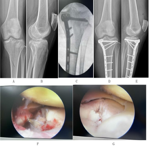 图1 膝关节镜引导微创复位胫骨平台骨折内固定术。注:58岁女性患者,左胫骨平台骨折Schatzker II型,A和B为术前X线正侧位片,C为术中关节镜辅助下开窗撬拨骨折块进行复位,D和E为术后X线正侧位片,F可见关节镜下探及胫骨平台关节面明显塌陷,半月板3度损伤,G为关节面完全复位以及半月板成形后所见画面。