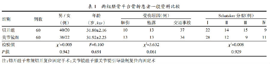两组患者性别、年龄、受伤原因、Schatzker分型等一般资料比较,差异无统计学意义(P均<0.05)。见表1。