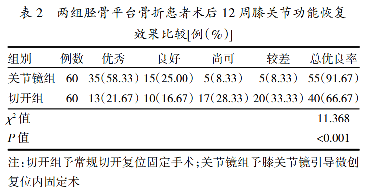 2、两组胫骨平台骨折患者术后12周膝关节功能恢复效果比较: