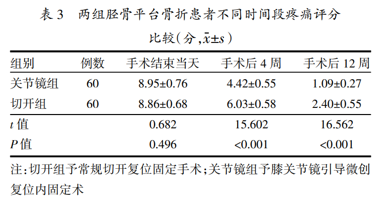 3、两组胫骨平台骨折患者不同时间段疼痛评分比较: