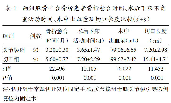 关节镜组骨折愈合时间、术后下床不负重活动时间、术中出血量及切口长度均优于切开组,差异有统计学意义(P<0.05),见表4。