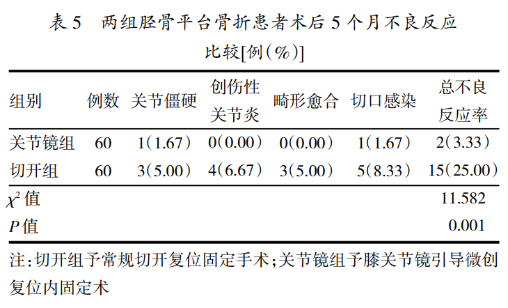 5、两组胫骨平台骨折患者术后5个月不良反应比较: