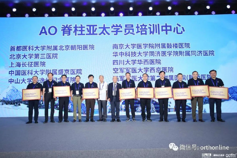 培训中心在AO Spine中国发展中起到了重要作用。为此,活动邀请党耕町、贾连顺、陈仲强、刘忠军共同为“AO脊柱亚太学员培训中心”授牌。十家培训中心为北京大学第三医院、海军军医大学第二附属医院、中山大学孙逸仙纪念医院、第四军医大学西京医院、南京鼓楼医院、陆军军医大学第二附属医院、首都医科大学附属北京朝阳医院、四川大学华西医院、中国医科大学附属盛京医院、华中科技大学医学院附属同济医院。十家培训中心代表李危石、袁文、黄东生、罗卓荆、邱勇、周跃、海涌、刘浩、王欢、李锋上台接牌。