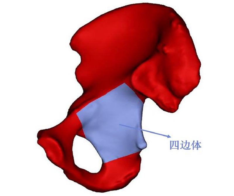 目前普遍认为,四边体的解剖界限是:上界为弓状线,下界为坐骨垂直体底部坐骨结节上缘,前界为闭孔后缘,后界为坐骨大切迹(图1)。从生物力学特性上看,髋臼窝顶部是髋臼的主要负重区,四边体是负重区的重要组成部分,具有维持股骨头与主要负重区的接触、防止股骨头向内侧移位突入盆腔的作用。人体在站立位时,负重力线由L5、骶骨经骶髂关节下传至四边体,经阻挡作用,股骨头滑移至髋臼窝顶部负重区,髋关节压力均匀分布在髋臼负重面上。四边体一旦发生骨折,就会导致关节对应关系改变、股骨头与髋臼力学失衡,引起髋臼整体力学失衡,如骨折复位不良,关节负重面减小、应力集中,则会加速关节软骨变性及创伤性关节炎的发生。