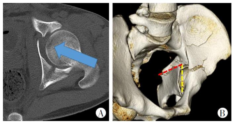 A.股骨头向前、向内的暴力撞击(蓝色箭头所示方向)是导致四边体骨折的主要致伤机制;B.垂直骨折线(黄色虚线)和横形骨折线(红色虚线)是四边体骨折形成的前提条件。