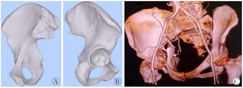 A、B. CT三维图像的半骨盆内侧面观和外侧面观;C. 骨-血管一体化三维图像。