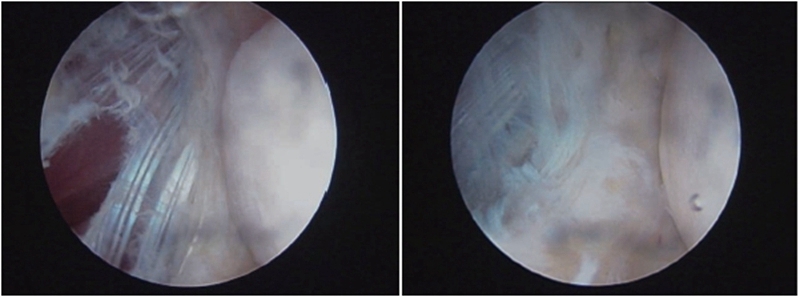 Baker等将损伤分为3型:第1型为关节镜下关节囊完整;第2型为关节囊下表面呈线性撕裂;第3型为关节囊完全撕裂与退缩。