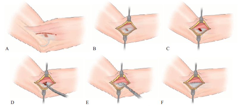 既往的切开手术有多种方式,应将所有病变组织并去除。手术采用外侧切口,切开皮肤及皮下组织后,寻找桡侧腕长伸肌与指总伸肌,在两者之间进入并显露桡侧腕短伸肌,将其自肱骨外上髁起点处以锐刀剥离并翻转,判断病变组织范围后彻底切除。将不同伸肌之间的筋膜组织缝合,逐层关闭伤口。