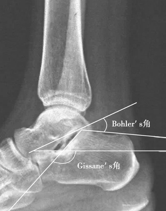 结节关节(Gissane)角:正常范围在125°~145°之间,跟距关节内骨折常造成此角增大或缩小(图1)。