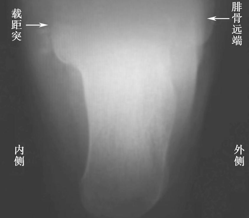 指的是下肢伸直,踝微屈曲,足内旋与平板探测器约成45°,以下胫腓联合为投照中心,球管向头侧倾斜10°、20°、30°、40°摄片,可显示后距下关节由后向前的不同部分,使劈裂的跟骨后关节面清楚显示。观察距下关节后关节面,必要时还可以作健侧对比照相,对术后检查复位与内固定情况也很有帮助(图3)。