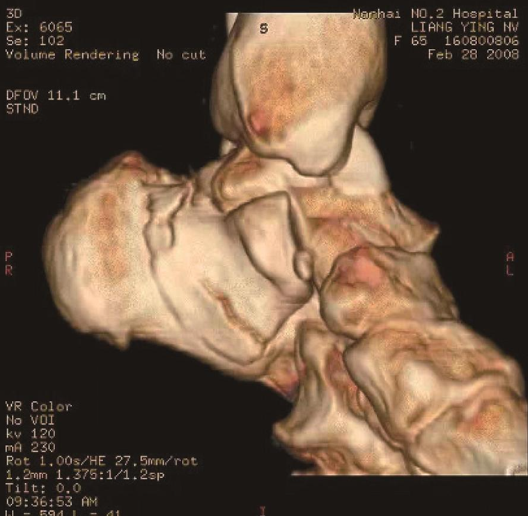 能够更加直观地观察其三维解剖结构及全面分析跟骨骨折后全骨形态改变。对跟距下关节面出现骨质移位、分离、凹陷性骨折的严重程度及关节内是否有碎骨片存在能做出更准确的判断(图4)。