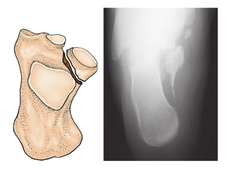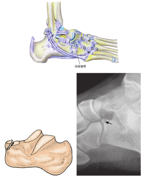 多见,常由足跖屈、内翻应力引起。暴力引起附着在跟骨前突及足舟骨、骰骨近端的分歧韧带紧张,造成跟骨前突撕脱骨折。骨折线伸入跟骰关节,骨折块较小,典型的情况下包含极少量的关节面(图5)。