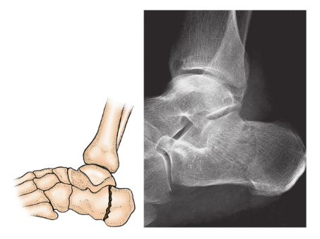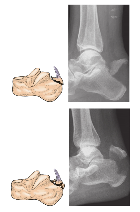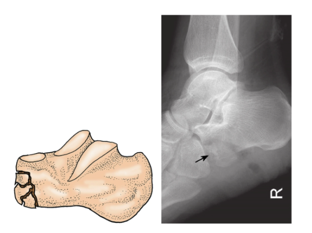 腓肠肌用力收缩时,足踝部在跖屈位突然受到使足背伸的暴力,则可产生跟骨后结节撕脱骨折。若足突然内翻和跖屈,分歧韧带强力牵拉,便产生前突骨折。