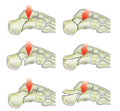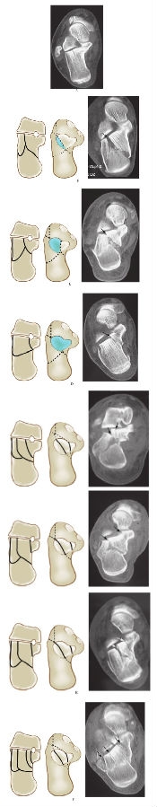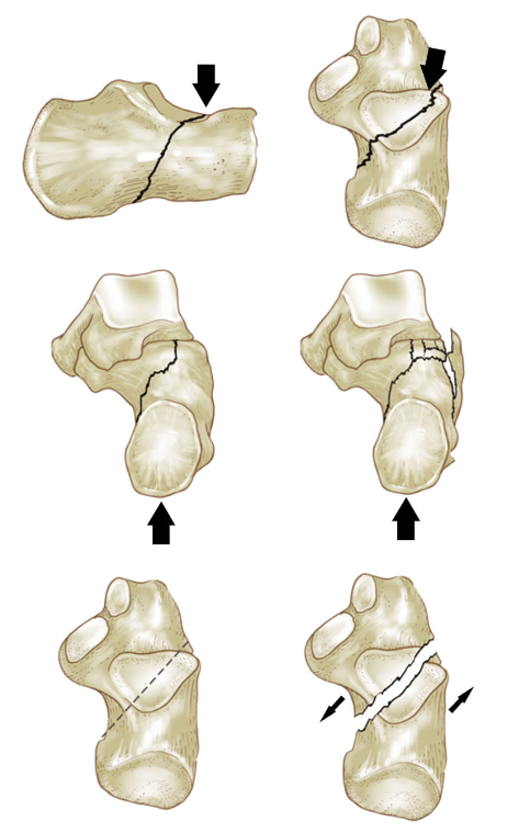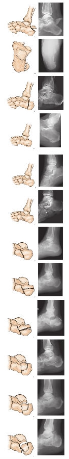 依跟骨受剪切力作用的部位和压力对各骨块的压缩情况而定,剪力引起的骨折,骨折线的位置变化基本可分为三种: