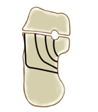 I. Ⅱ型:骨折累及距下关节,A3继发性骨折线水平向后行至跟腱止点的远侧,舌形骨片包括跟骨体上面和后关节面的外侧部。舌形骨折,骨片前端陷入跟骨体松质骨内,后端上翘,骨折块分离移位