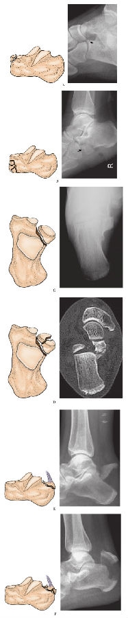 图16 按解剖部位分型A.跟骨前突骨折;B.跟骨结节骨折;C.跟骨内侧突骨折;D.跟骨载距突骨折;E.跟骨体部骨折(不累及距下关节)