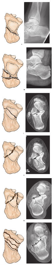 Sanders分型于1993年由Sanders提出,根据跟骨骨折的CT情况分型。这种分型主要反映了跟骨后关节面的损伤程度,对治疗方法的选择和判断预后有重要意义。此分型基于冠状位和轴位CT表现,在冠状面上选择跟骨后距下关节面最宽处,从外向内有两条线将其分为相等的三等部分,分别由A、B代表等分点,距下后关节面和载距突之间为C点,跟骨后距下关节面上的骨折线以其相对应的A、B、C点代表骨折线的位置。这样,就可能有四部分骨折块,三部分关节面骨折块和一部分载距突骨折块(图12)。