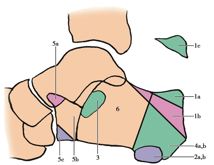 Ⅲ型:跟骨后关节面有两条骨折线三个骨折块,又分ⅢAB、ⅢBC及ⅢAC三个亚型。各亚型均有一中央塌陷骨折块。