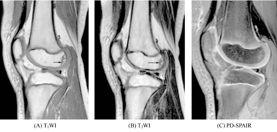 半月板的MRI检查主要取矢状位和冠状位,前者有利于显示前后角,后者适于观察体部。正常半月板在T1WI及T2WI上均为均匀的低信号,半月板损伤表现为相对的高信号影。