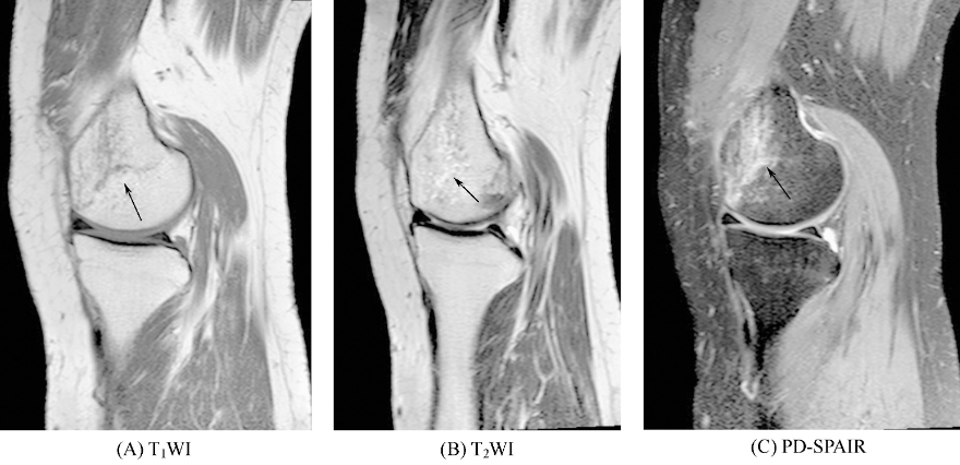 图2 骨挫伤右股骨内侧髁见模糊片状长T1长T2信号影,PD-SPAIR病变呈明显高信号。
