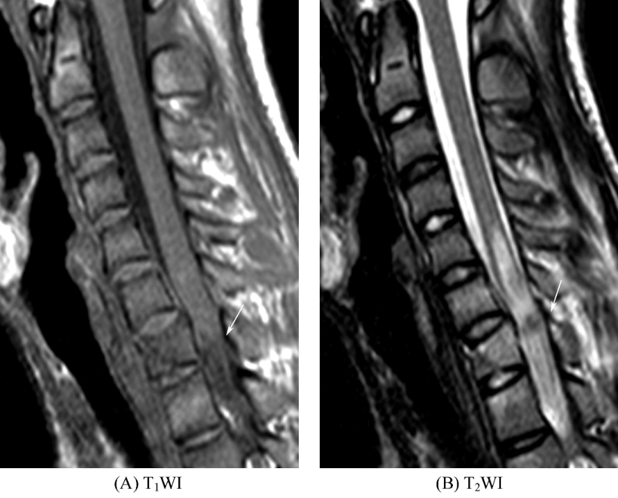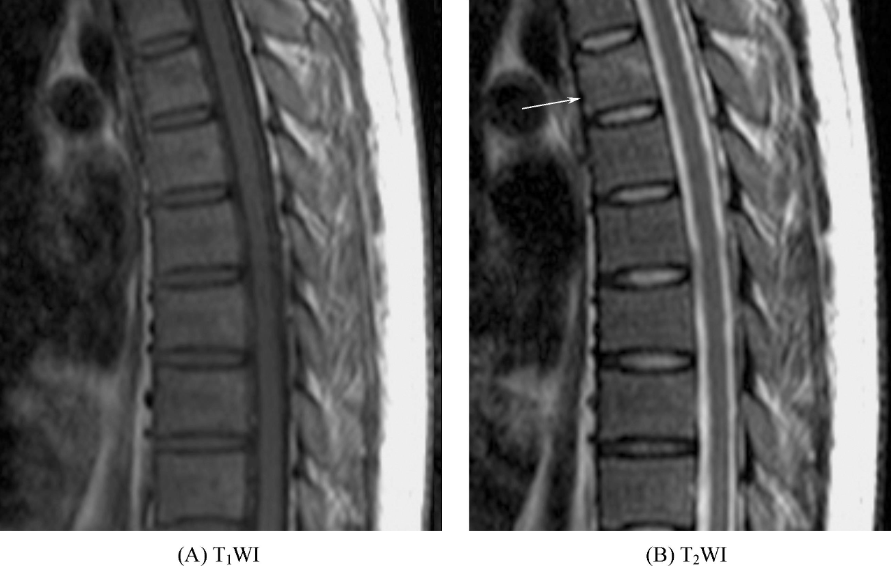图3 椎体爆裂骨折胸7椎体楔形变,T1WI上信号减低,T2WI上信号增高,内见线状短T1长T2信号影,胸5~胸8椎体水平脊髓内见条片状长T1长T2信号影。