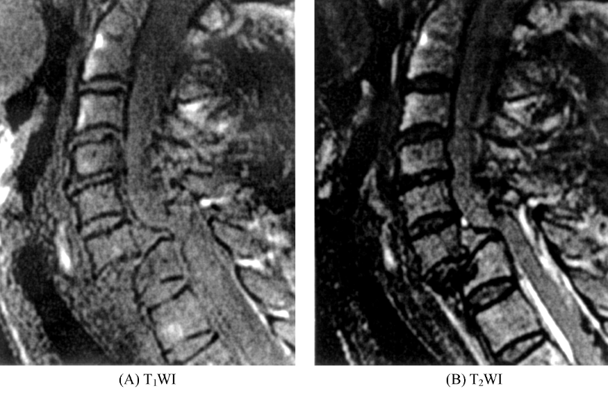骨骼肌肉系统的各种组织有不同的弛豫参数和质子密度,MRI图像具有良好的天然对比,能很好地显示骨、关节和软组织的解剖形态,加之其各种方向的切面图像,能显示X线片甚至CT不能显示或显示不佳的一些组织和结构如关节软骨、关节囊内外韧带、椎间盘和骨髓等。MRI能很好分辨各种不同的软组织,在MRI图像上脂肪、肌肉、肌腱、神经、血管以及肿瘤组织都有不同的信号特点。