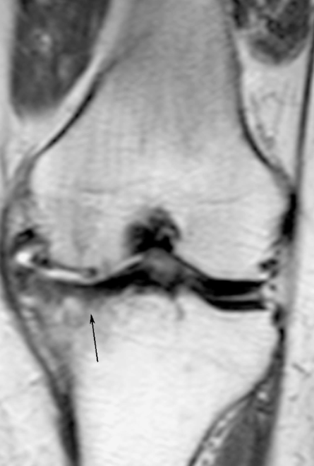 图6 关节软骨损伤冠状位T1WI示胫骨内侧髁关节软骨缺失,骨性关节面欠光滑,关节面下骨质内见大片状稍长T1信号影。