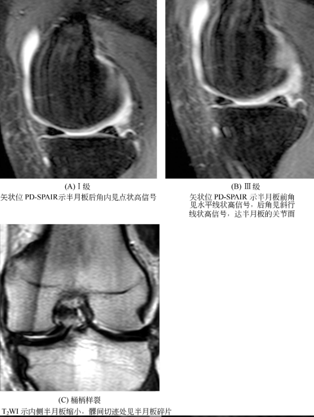 病情根据高信号影的形态以及是否延及半月板上下缘分为三级:
