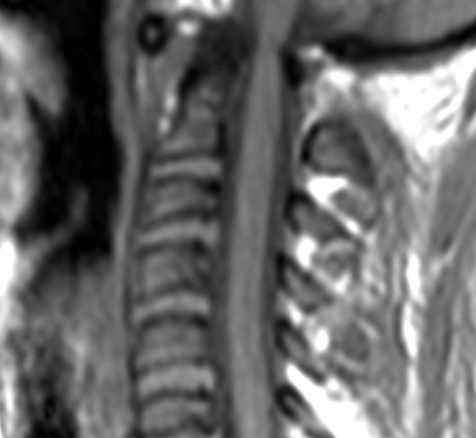 图8 关节半脱位矢状位T1WI示寰椎前弓与枢椎齿突间距增宽,约5.5mm。