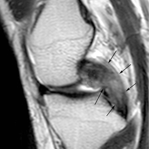 图9 矢状位T2WI示后交叉韧带增粗、信号升高。