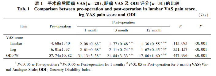 所有患者均顺利完成手术。手术时间85~130 min,平均手术时间(101.52±10.57)min,估计出血量<50 mL。硬膜囊撕裂1例,给予积极补液、床尾抬高等对症处理后症状缓解;短暂性下肢麻木1例,患者麻醉苏醒后诉患侧下肢麻木,术后观察6 h症状无明显缓解,给予甲强龙80 mg静脉输液治疗后,症状明显改善。所有病例均未发生血管、神经损伤、类脊髓高压反应等相关并发症,切口均一期愈合,无感染病例。