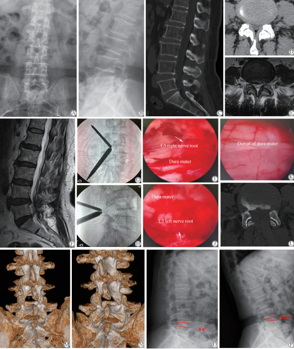 C-F: pre-operation CT and MRI: bilateral lateral recess stenosis in L4 / 5,with bilateral L5 nerve roots compressed;
