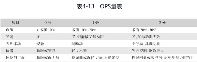 ⑩伸舌(只用于评估早产儿)。如果患者无以上各项表现为0分,有其中1项为1分。NFCS的总分为10项之和,最低为0分。早产儿最高为10分,足月儿为9分(因“伸舌”只用于评估早产儿),分值愈高表示疼痛愈严重。将NFCS减少至5项(皱眉、挤眼、鼻唇沟加深、嘴水平伸展和舌呈杯状),提高了对疼痛评估的特异性,但并不改变其效度和敏感性。目前4岁以下儿童疼痛的评估多采用简单的行为学评估,通过测量疼痛相关的行为学表现或者对由患者父母或监护人提供的疼痛的叙述进行评估,然后计算其积分,主要的量表包括OPS量表(客观疼痛评分量表,objective pain scale)(表4-13),该法不需儿童参与,根据血压、哭闹程度、运动、烦躁情况及语言或形体语言进行疼痛的评估,每个指标分为3级,分别为0、1、2分。