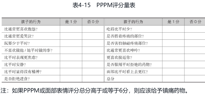 PPPM评分量表(术后疼痛家长评估量表)(表4-15),适用于1~12岁出院患者。CRIES量表(表4-16),适用于胎龄32~60周的新生儿、婴儿术后疼痛进行评估。