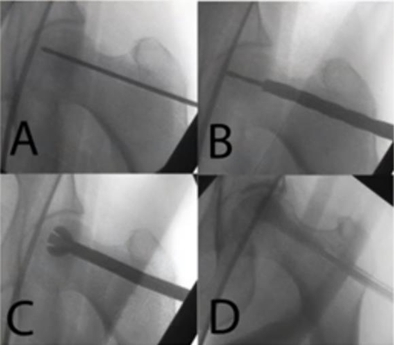 单孔髓芯减压术是使用8~10mm的环钻或空心针,在X线透视下从转子下方骨皮质经股骨颈达到股骨头坏死区域,进而清除坏死骨组织,其临床疗效常取决于分期。