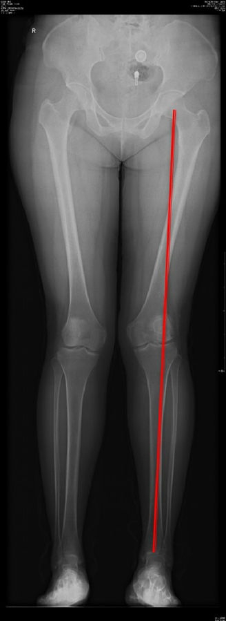 画下肢机械轴,股骨头中心链接踝关节中心判断患者为内翻畸形还是外翻畸形。此患者为外翻畸形。