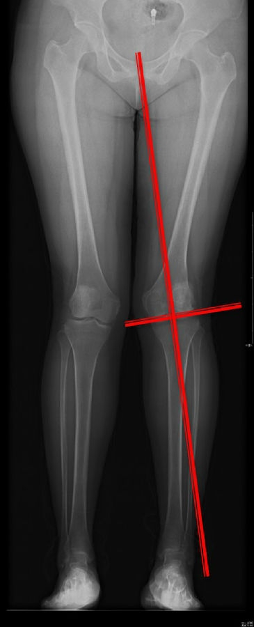 患者在整体力线上既可以表现为膝内翻,也可以表现为膝外翻。有研究表明,内翻膝股骨畸形占59%,内翻膝胫骨侧畸形占31%,内翻膝股骨+胫骨畸形占10%;外翻膝股骨畸形占22%,外翻膝胫骨畸形占45%,外翻膝股骨+胫骨畸形占33%。