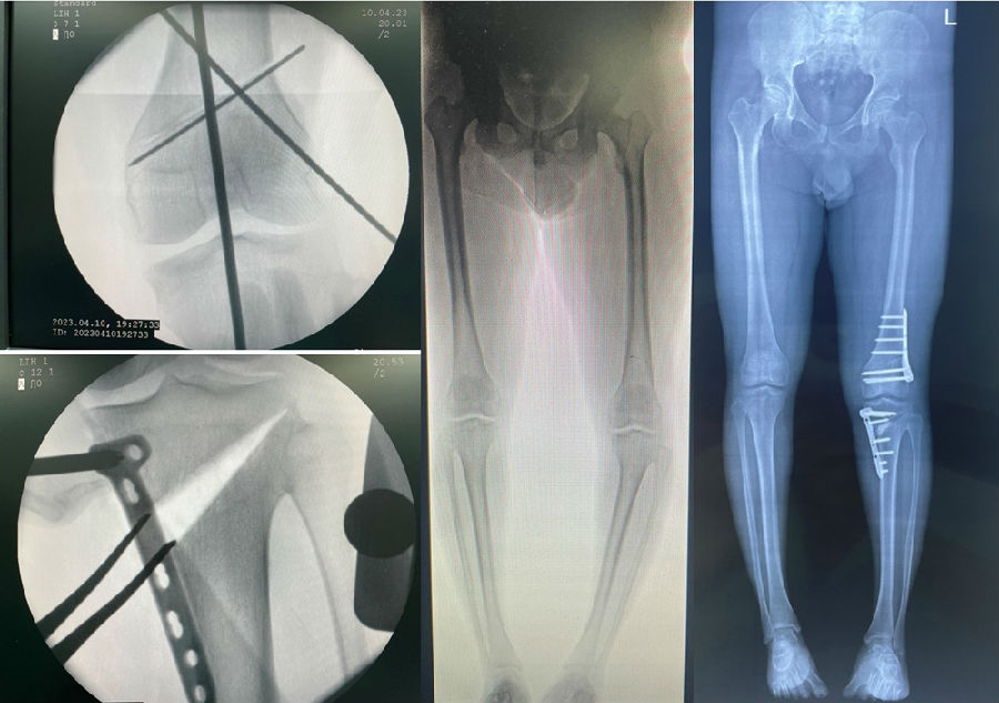 对于手术顺序,提倡先做股骨。当股骨闭合,胫骨开放时,推荐优先做股骨,有利于准确调整下肢力线;当股骨闭合,胫骨闭合,同样推荐先做股骨,不容易发生相应的并发症。但是当出现术前全长片不标准,术前计划不准确时,建议先胫骨,胫骨较容易看关节线。
