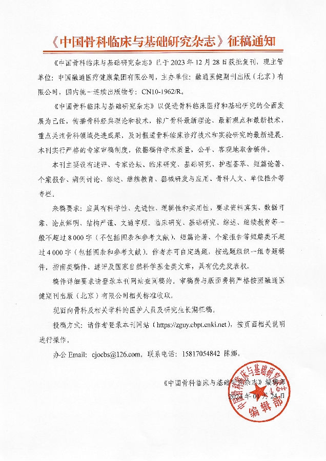 杂志复刊后主办单位为融通医健期刊出版(北京)有限公司,编辑部仍设在广州市流花路111号(现中国人民解放军南部战区总医院内)。《中国骨科临床与基础研究杂志》(CN10-1962/R)为双月刊,逢双月15日出版,投稿网站:https://zguy.cbpt.cnki.net,E-mail:cjocbs@126.com。