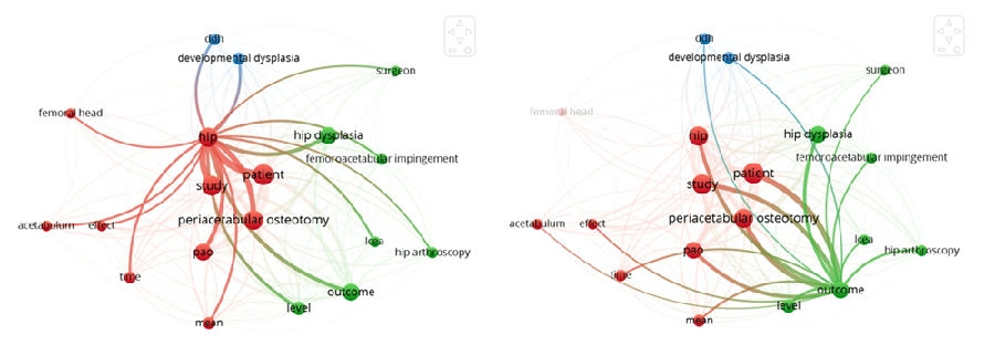 对2023年所有保髋文章关键词进行初步分析,除了中心关键词hip以外,这些研究中第二常用的关键词是Outcome,这说明今年的保髋研究非常贴近临床实践,真正从患者的需求出发,越来越注重患者临床疗效的观察,注重患者功能的康复和回归社会的程度,体现了医疗以人为本。