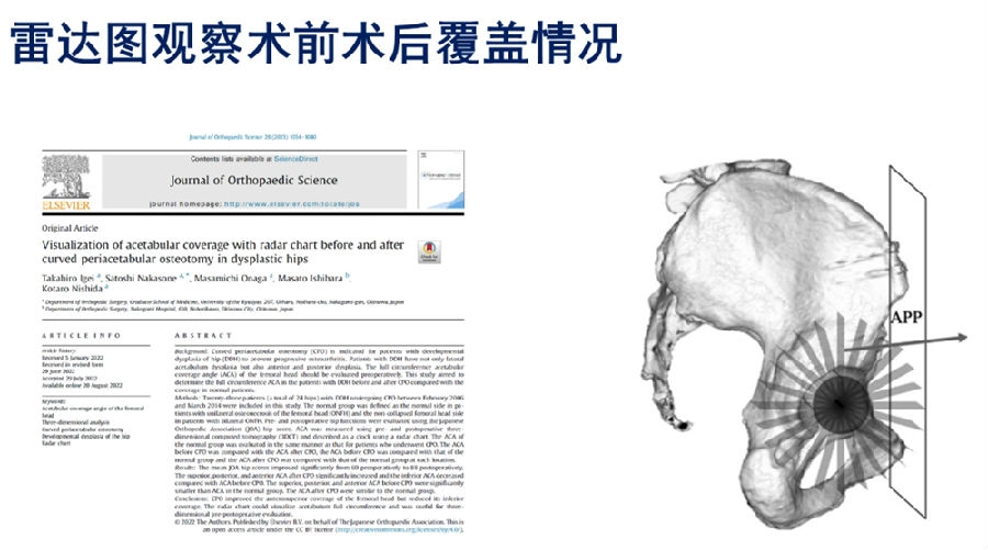 与手术前相比,手术后的上、后、前ACA明显增高,下ACA明显降低。CPO前的上、后、前ACA均明显小于正常组。CPO后ACA与正常组相似。平均JOA髋关节评分从术前的69分显著提高到术后的88分。得到结论CPO:提高了股骨头的前上覆盖,但减少了股骨头的下覆盖。雷达图可以显示髋臼的全周长,有助于术后三维评估。