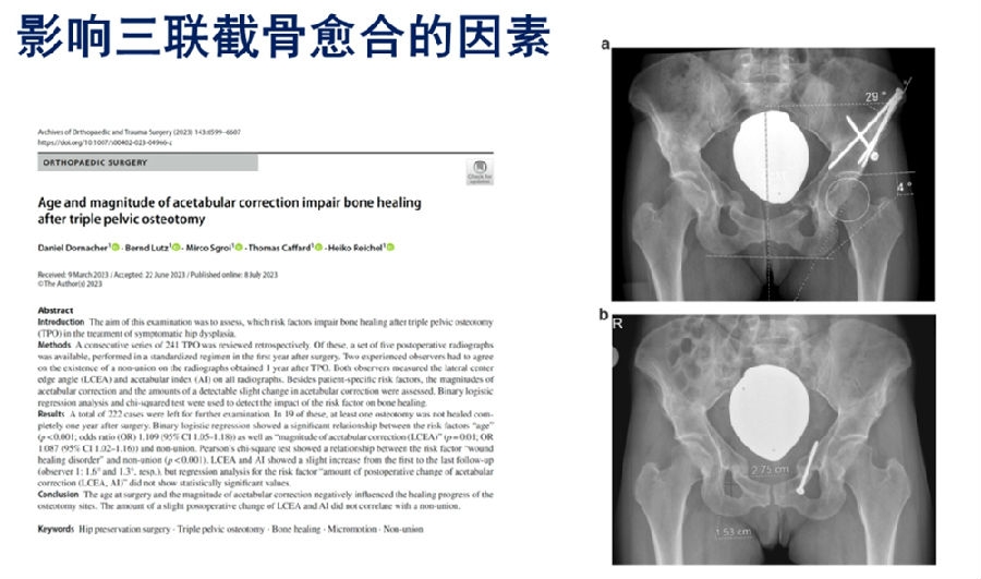总的来说,患者的手术年龄,髋臼矫正的大小,以及切口愈合障碍都会对骨愈合产生影响。