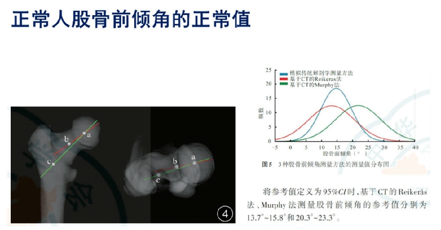 研究发现,传统解剖学方法得出的股骨前倾角数值为14.8°±5.0°,Reikeras法得出的数值为13.3°±7.2°,而Murphy法得出的数值为21.8°±7.3°。研究结果显示,这三种方法之间的测量结果具有良好的一致性,组内相关系数在0.960至0.987之间。