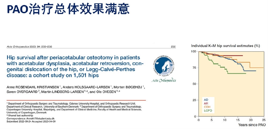 1.丹麦登记系统结果显示,PAO治疗发育不良、髋臼后倾、先天脱位、Perthes病总体效果满意[15]。