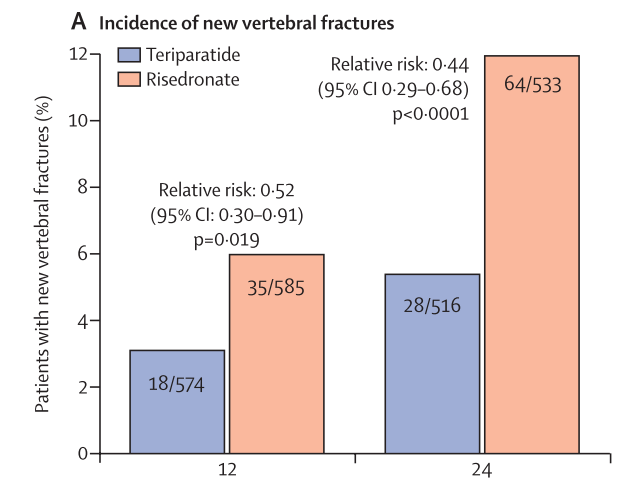多个国际指南指出,在治疗极高骨折风险患者时,应优先选用骨形成促进药物,因为其降低骨折风险的作用更强,起效更快。3,7,8 2020年一项Meta分析共纳入57项随机试验,包含15项抗骨质疏松干预试验(n=106320),对比不同药物用于预防绝经后妇女骨折和再骨折的疗效和安全性。研究发现,罗莫佐单抗、阿巴帕肽和特立帕肽等促骨形成药物均能有效降低既往存在骨折史患者再发骨折的风险。12一项针对极高骨折风险者的研究中,比较注射特立帕肽和口服利塞膦酸盐对降低新发骨折风险的效果,特立帕肽防治再骨折的效果明显优于利塞膦酸盐。13(图3)