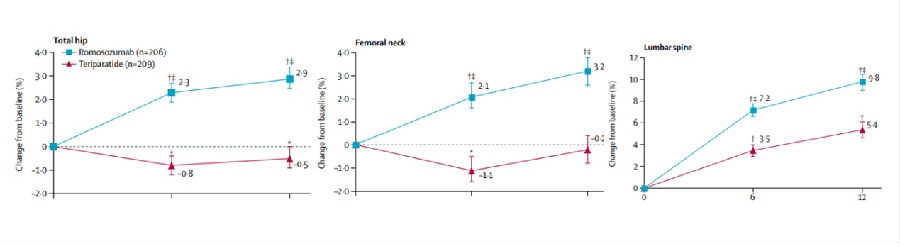 在促成骨药物中,罗莫佐单抗是第一个也是唯一通过抑制硬骨抑素发挥双重作用的促成骨药物,既增加成骨细胞的活性,又降低破骨细胞的活性。14 2016年一项纳入7180名骨质疏松症女性的RCT研究显示,与安慰剂相比,罗莫佐单抗治疗12个月可将椎体骨折风险快速降低73%。152017年一项纳入4093名极高骨折风险女性的RCT研究显示,与阿仑膦酸钠持续治疗24个月相比,罗莫佐单抗(12个月)后换用阿仑膦酸钠(12个月)能够降低48%的新发椎体骨折风险。16同时也有研究显示,在接受过双膦酸盐类药物治疗的患者中,与特立帕肽相比,罗莫佐单抗更能显著提高12个月时腰椎、全髋及股骨颈的骨密度。17 (图4)目前该药尚未在我国上市,三期临床研究正在进行。